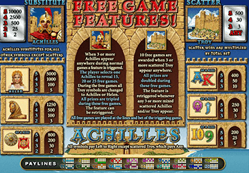 Игровой аппарат Achilles силен в своих возможностях за счет особых символов – Вайлда и Скаттера. Вайлдом разработчики сделали символ самого героя, а Скаттером стало изображение Трои. Дикий заменит любые символы, чтобы могла образоваться новая комбинация. Скаттер стартует раунд из 10 фриспинов, выплаты по которым будут утроены. Сюрпризом для игроков станет шанс продолжения раунда бесплатных вращений. Для этого нужно, чтобы на барабанах повторно выпало три Скаттера или Вайлда.