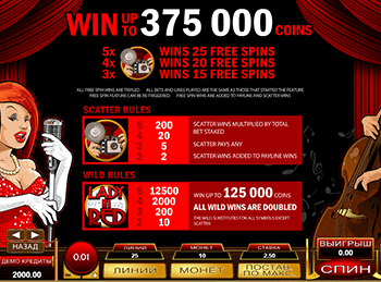 Изображение девушки в красном имеет коэффициенты 2, 50, 400, 2500. Пианист принесет множители 2, 25, 200, 500. Розы и стакан с виски – 10, 80, 300. Карты 9 и 10 – 5, 20, 125. Валет и дама – 6, 25, 150. Король и туз – 6, 30, 200.